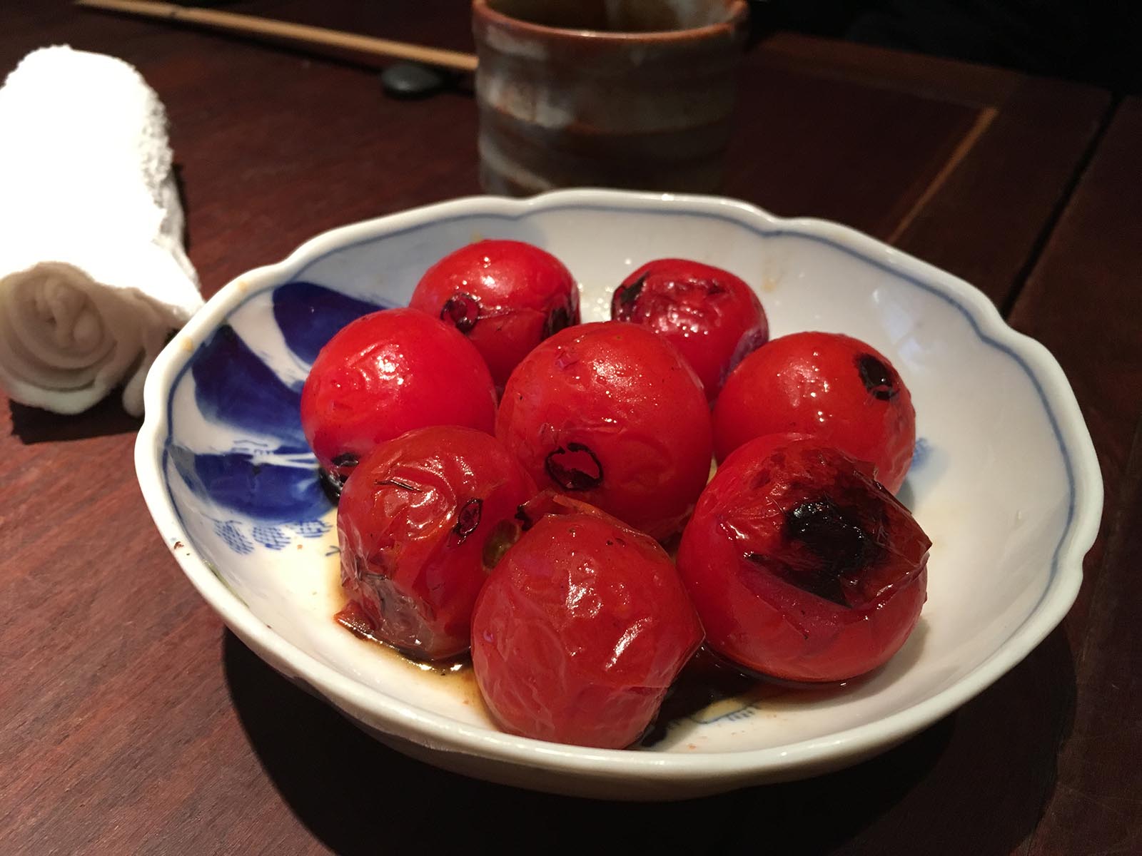 お通しで出てきたあぶりミニトマトがめちゃくちゃ美味しかった!!!外は香ばしくて中は甘い。すごい。